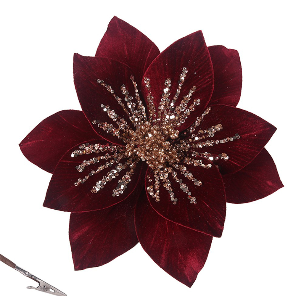 Burgundy and gold fabric poinsettia perfect for any Christmas tree, wreath, or garland.