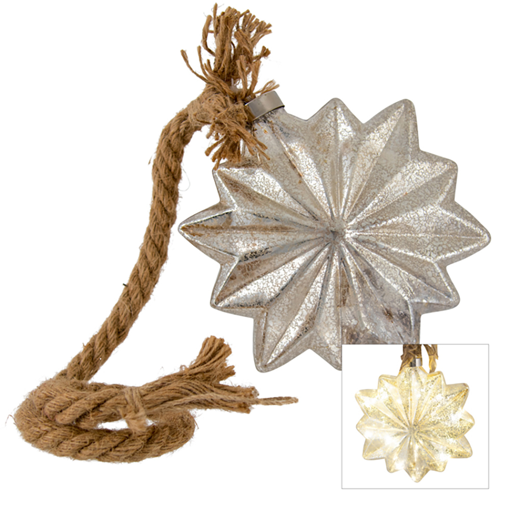 Antique glass star with warm white light. Cool look when turned off turns into a champagne glow when illuminated.