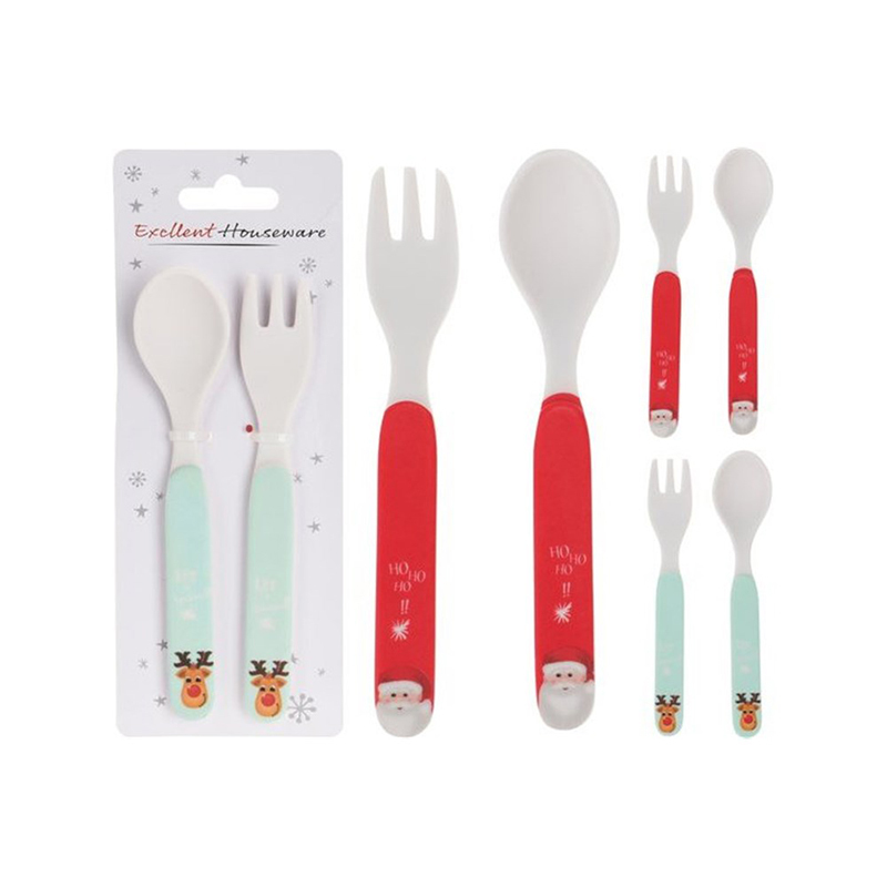 A 4 piece melamine childs dinner plate, bowl, cup, and 2 pc cutlery set.
