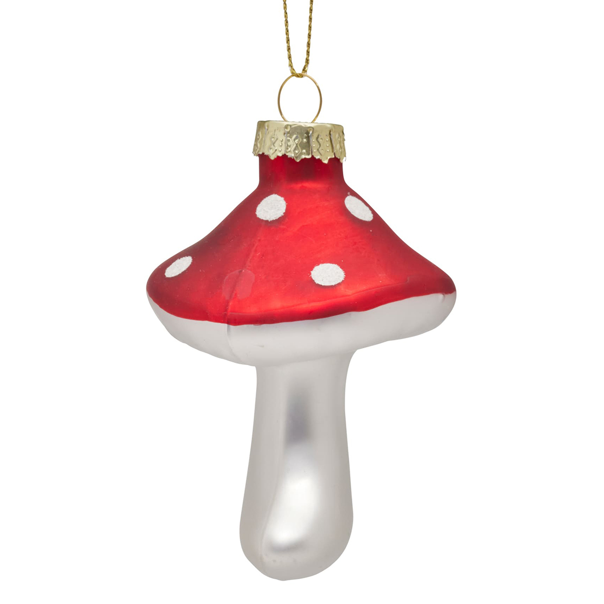 A classic red and white glass mushroom to hang on your Christmas tree.