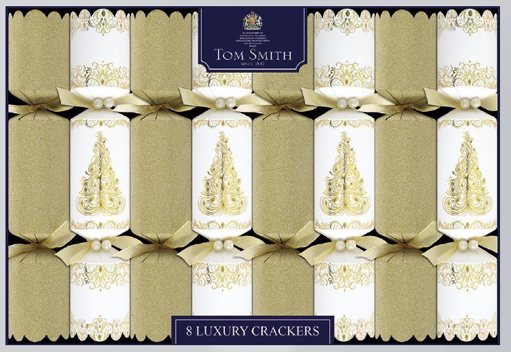 31.5cm / 12.5in luxury gold and cream crackers with quality gift, hat, motto and snap. Pk 8 Contents may vary from illustrated.