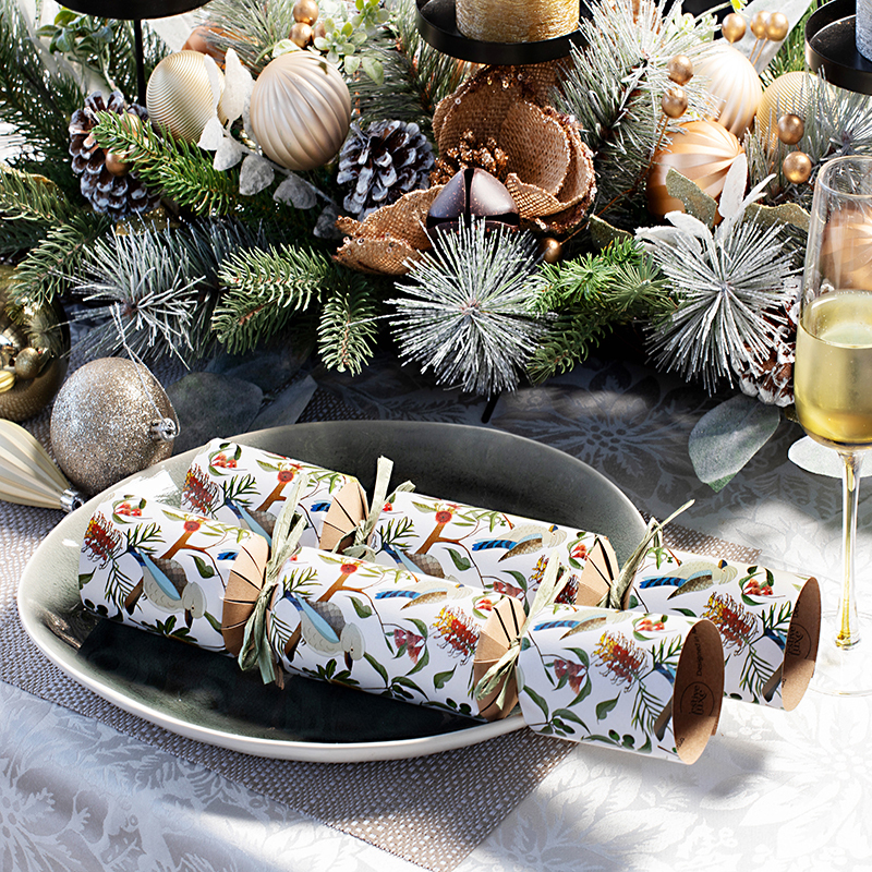 Australian kookaburra and fauna imagery on a plastic free kraft Christmas cracker.
