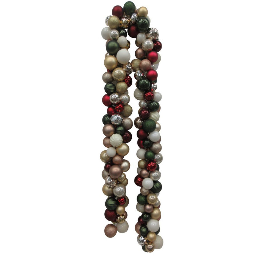 An unusual garland of mixed baubles in shades of greens, reds, golds, and white.