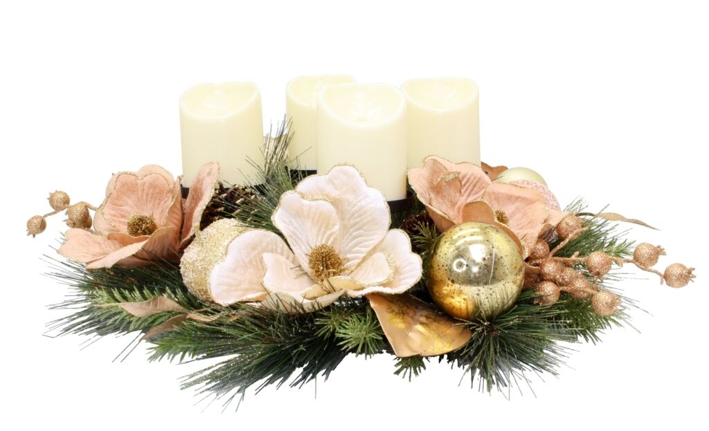 Mixed shades of gold and copper magnolia flowers, cones, with matching baubles, apples and berries, combined with mixed green foliage tinged with gold.