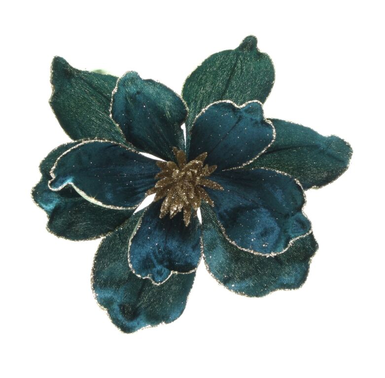 Peacok and gold fabric magnolia clip on flower. 21cm