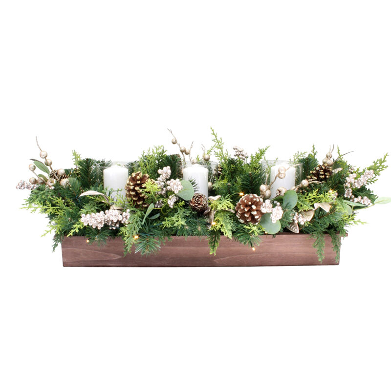 Champagne pearl leaves and berries combined with cones and mixed green foliage.