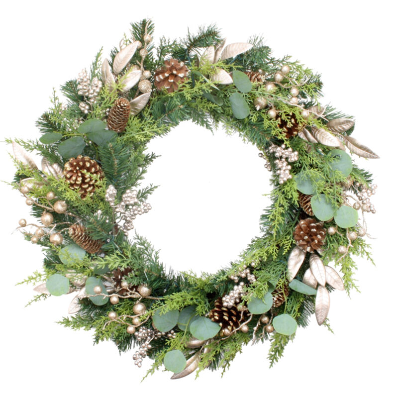 Champagne pearl leaves and berries combined with cones and mixed green foliage.