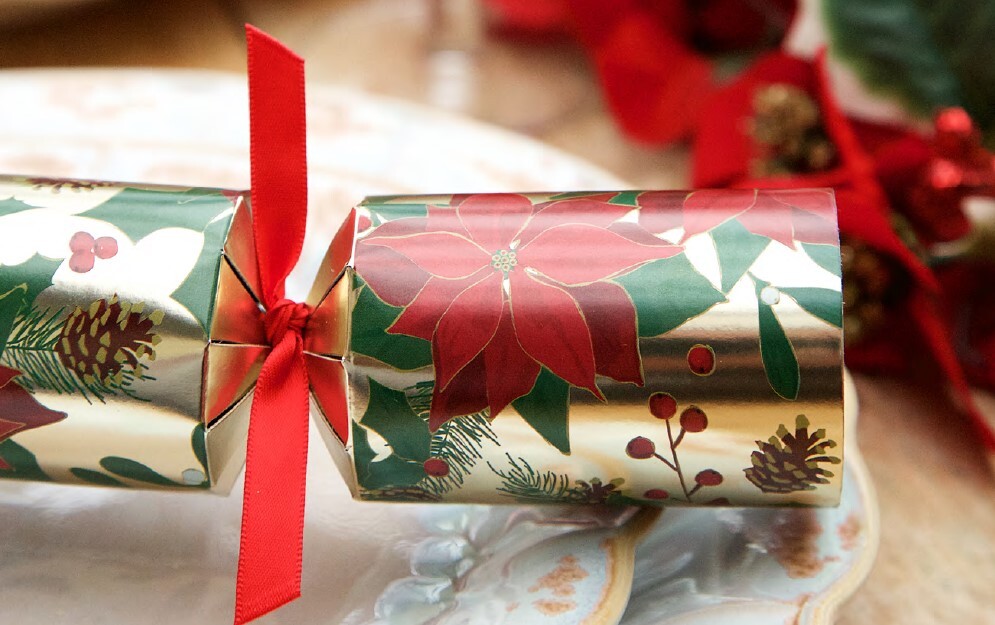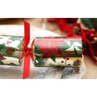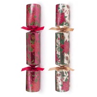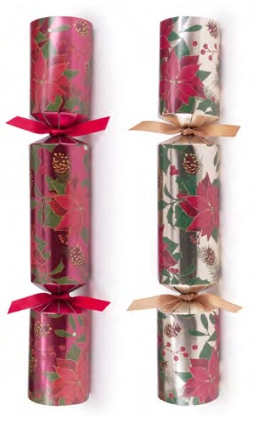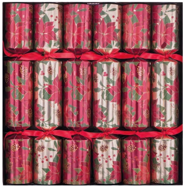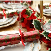 Poinsettia Crackers 6pk 30cm. Each cracker contains a hat, gift, hat and joke. Contents may vary slightly from those indicated.
