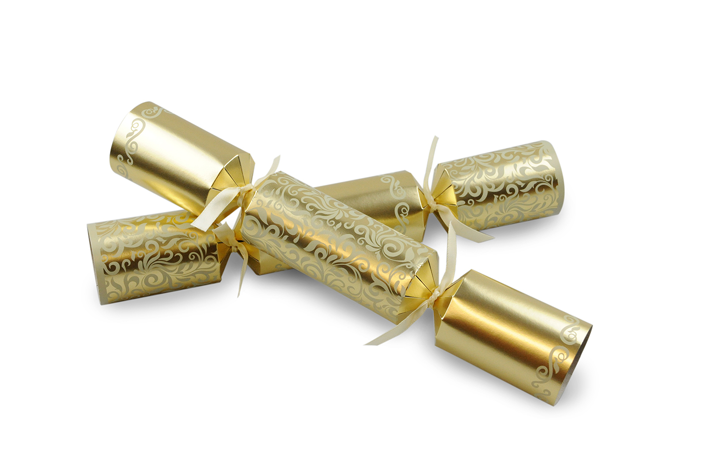 Premium Gold Damask Crackers 6x30cm Contains gift, hat joke and snap. Contents may vary from images.