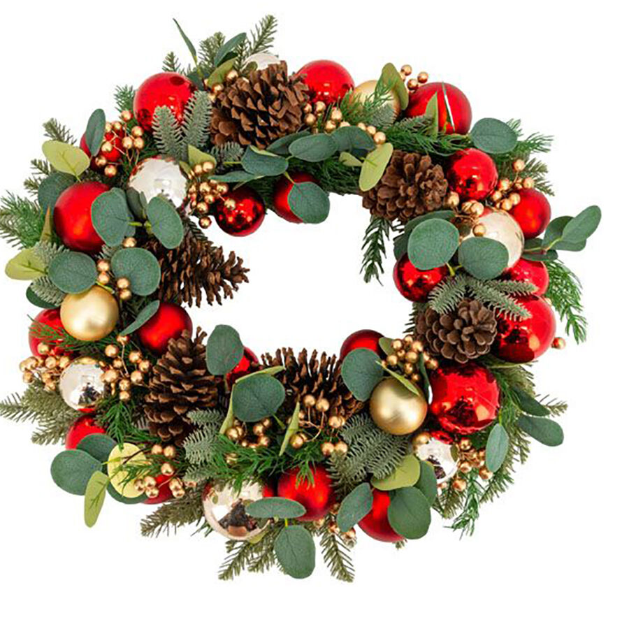 Red Gold Festive Christmas Wreath with Berries Cones and Baubles