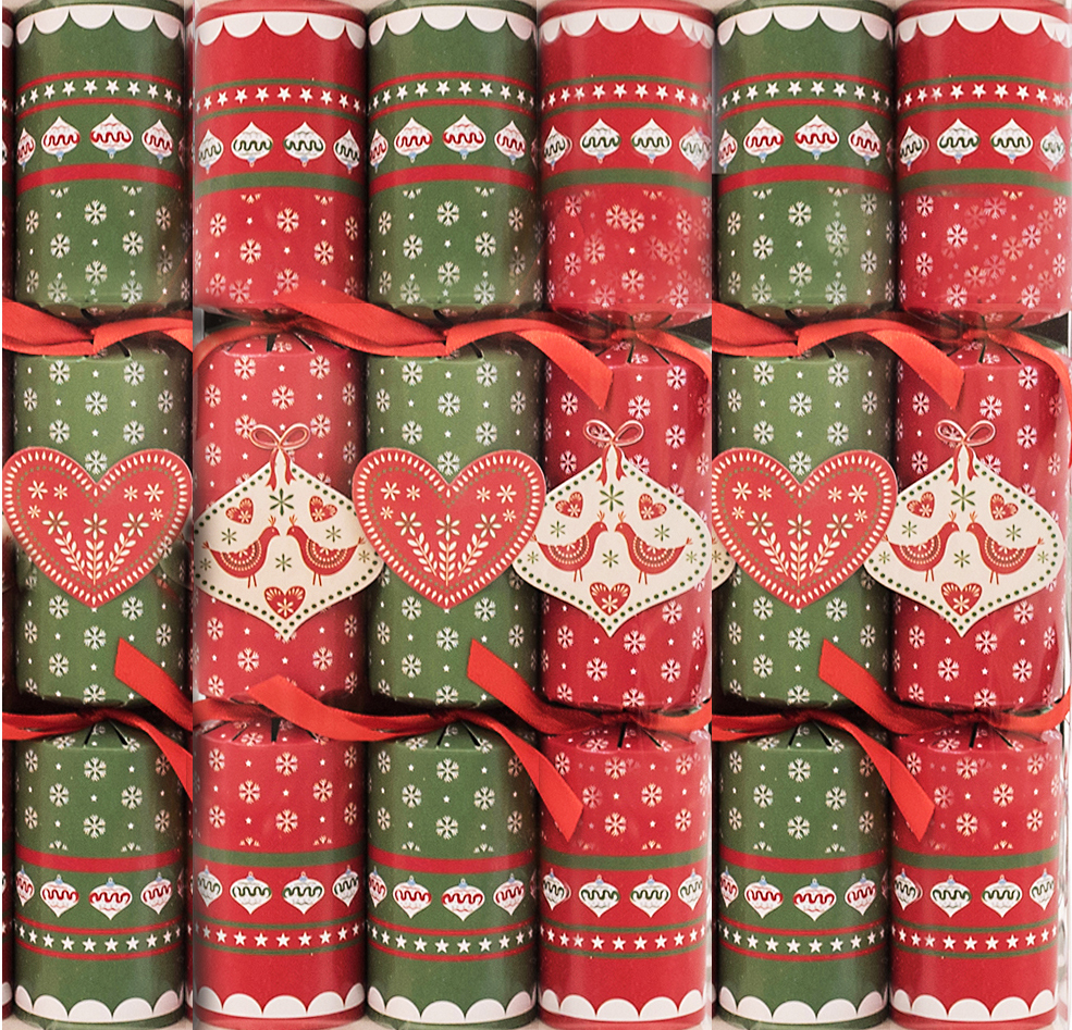 Red Green with Tags 6pk x 30cm. Each cracker contains gift, hat, snap and joke