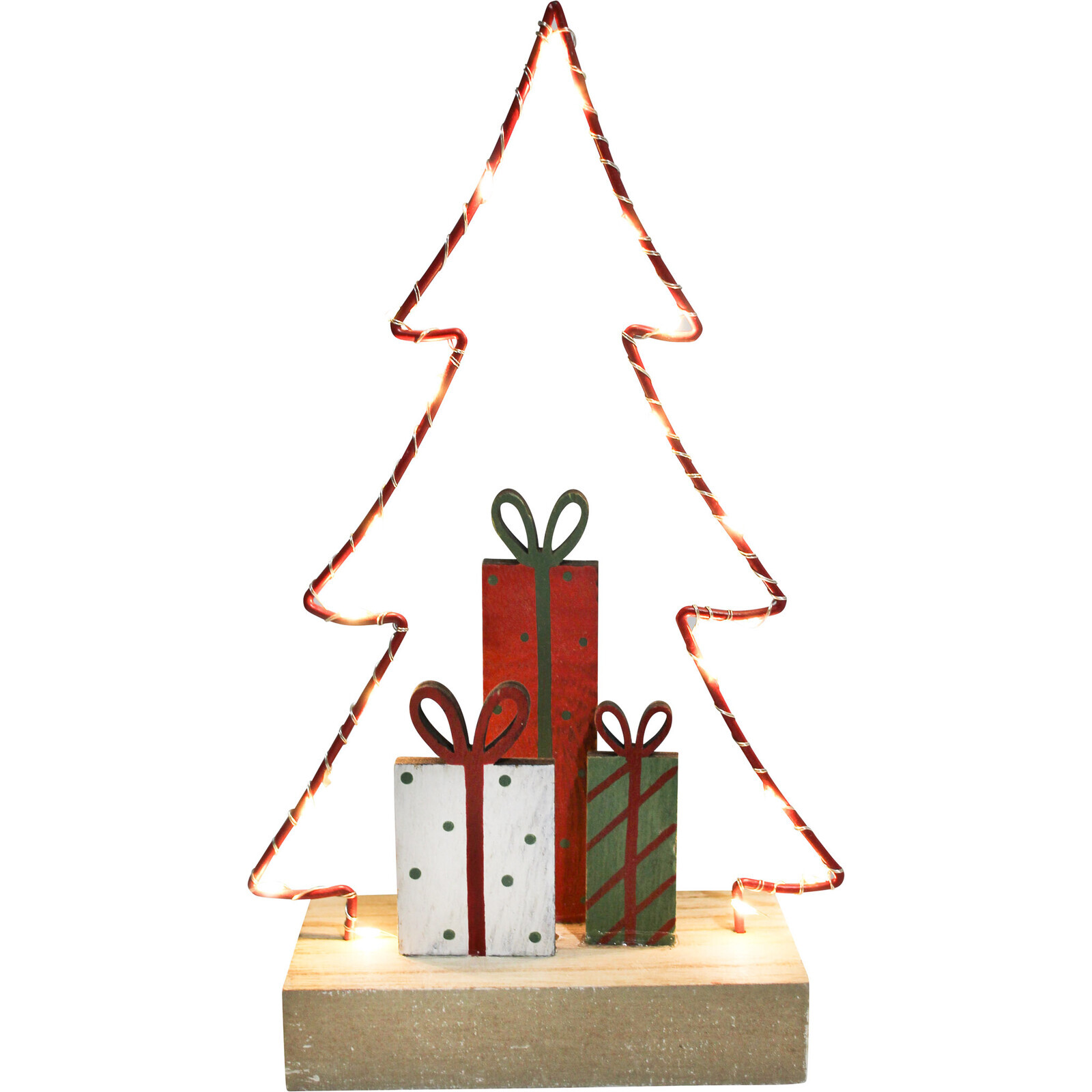 A small LED tabletop tree with timber gifts. Require 2AAA batteries which are NOT included.