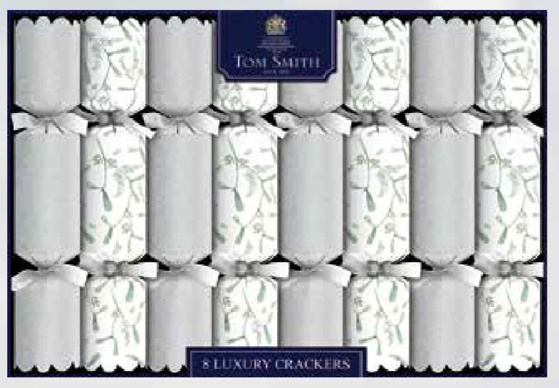 Tom Smith Silver Foliage Premium Cracker 8 x 31.5cm. Each cracker contains gift, hat, snap and joke Indicative contents illustrated.