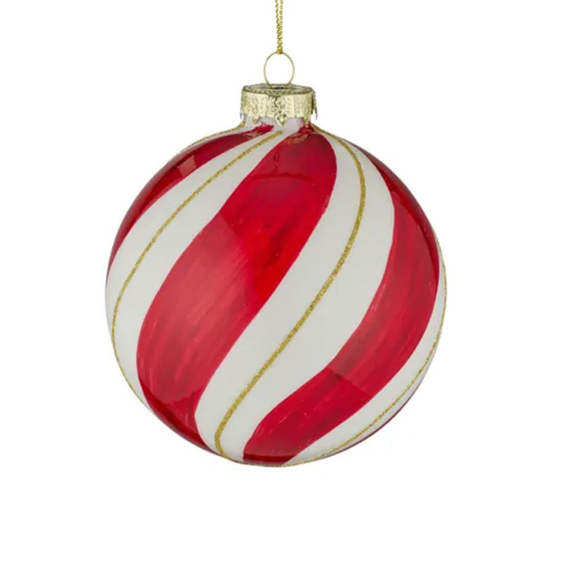 White Glass Hanging Christmas Bauble with Red and Gold Stripes